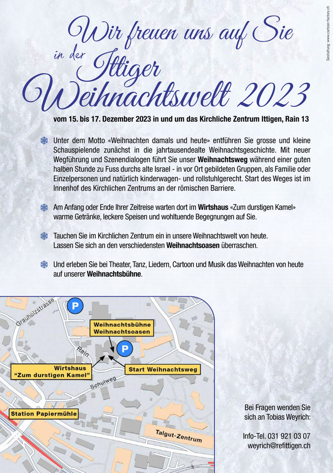 Weihnachtsweg: Rundgang durch die inszenierte Weihnachtsgeschichte, Dauer ca. 35 Minuten.